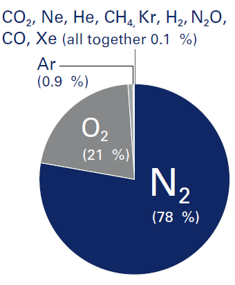 A levegő egy gázelegy, nagy részben nitrogénből (78%), oxigénből (21%), és argonból (0,9%) áll. A maradék 0,1%-ot szén-dioxid, és olyan nemesgázok alkotják, mint a neon, hélium, kripton, xenon.