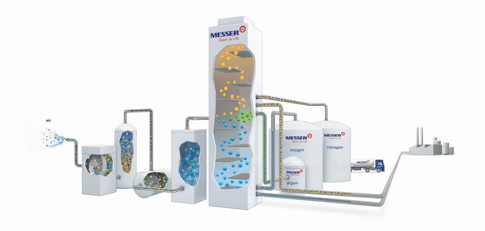 A levegőszétválasztó üzemekben egy desztillációs folyamat (alacsony hőmérsékletű rektifikálás) segítségével bontjuk a levegőt alkotóelemeire, kihasználva, hogy az egyes gázok forráspontja – és ennek folytán cseppfolyós állapotban illékonysága – kisebb-nagyobb mértékben eltér egymástól. Így nyerjük ki nagytisztaságú koncentrációban a nitrogént, oxigént és argont – gáz vagy cseppfolyós halmazállapotban.