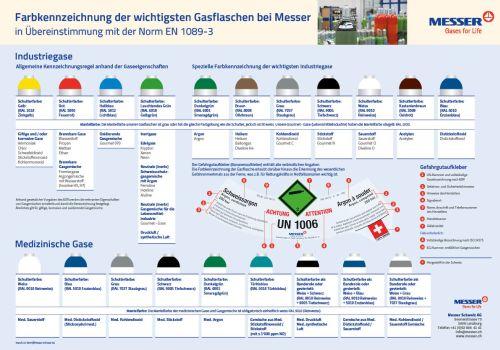 Die Farbcodierung der Gasflaschen gibt Auskunft über die Gefahr und den Inhalt. Die Norm dient dazu, die Gefahr einer Flasche auch aus der Ferne einzuschätzen und Verwechslungen auszuschliessen.